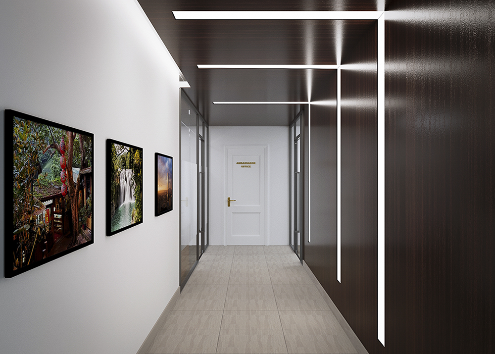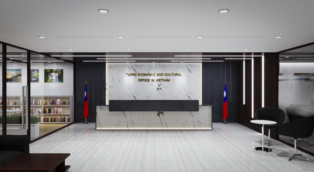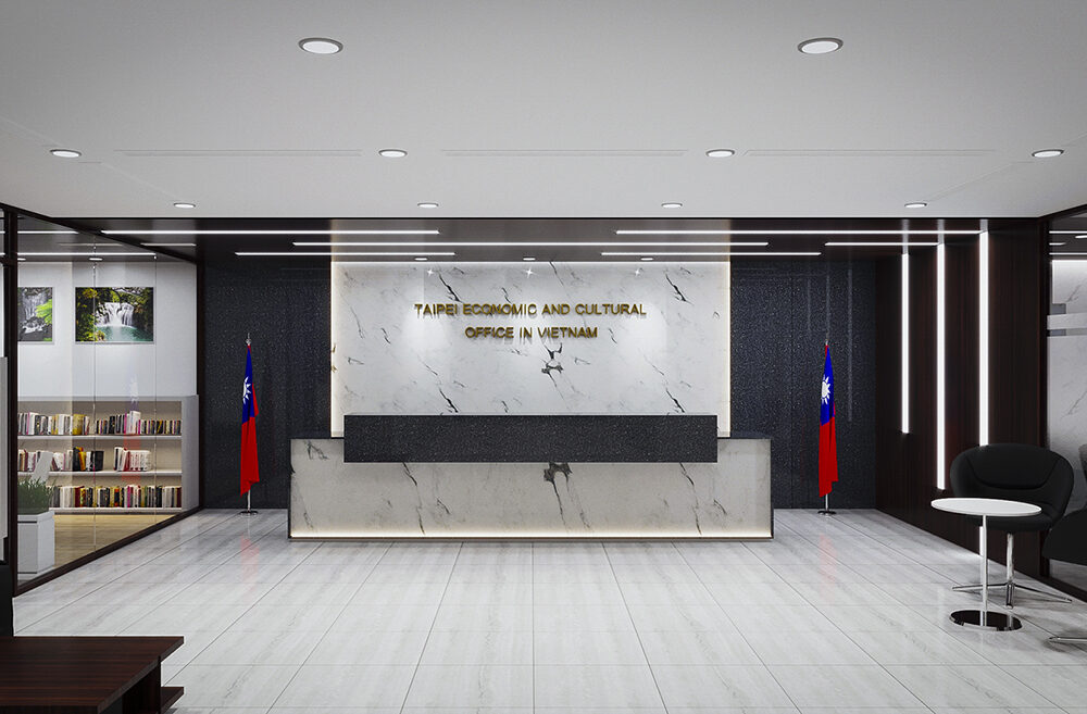 Sảnh đón tiếp hiện ra với vẻ trang trọng và tinh tế, như khoảnh khắc mở đầu cho một hành trình đầy uy tín. Mảng đá marble trắng vân đen phía sau quầy lễ tân sáng lên dưới lớp đèn hắt mềm mại, khiến dòng chữ vàng “TAIPEI ECONOMIC AND CULTURAL OFFICE IN VIETNAM” trở nên nổi bật và trang trọng. Hai lá cờ được đặt cân đối hai bên, đứng trang nghiêm như những điểm nhấn biểu trưng cho sự hiện diện chính thức và tôn trọng. Không gian được bao bọc bởi kính trong suốt và những mảng gỗ trầm, tạo nên sự hài hòa giữa hiện đại và ấm áp. Ánh sáng trần rọi xuống sàn sáng bóng trong không gian sảnh rộng mở, sang trọng và đầy tính biểu tượng. Tổng thể không gian toát lên vẻ trang nhã, chuyên nghiệp và đậm tinh thần văn hóa – ngoại giao.